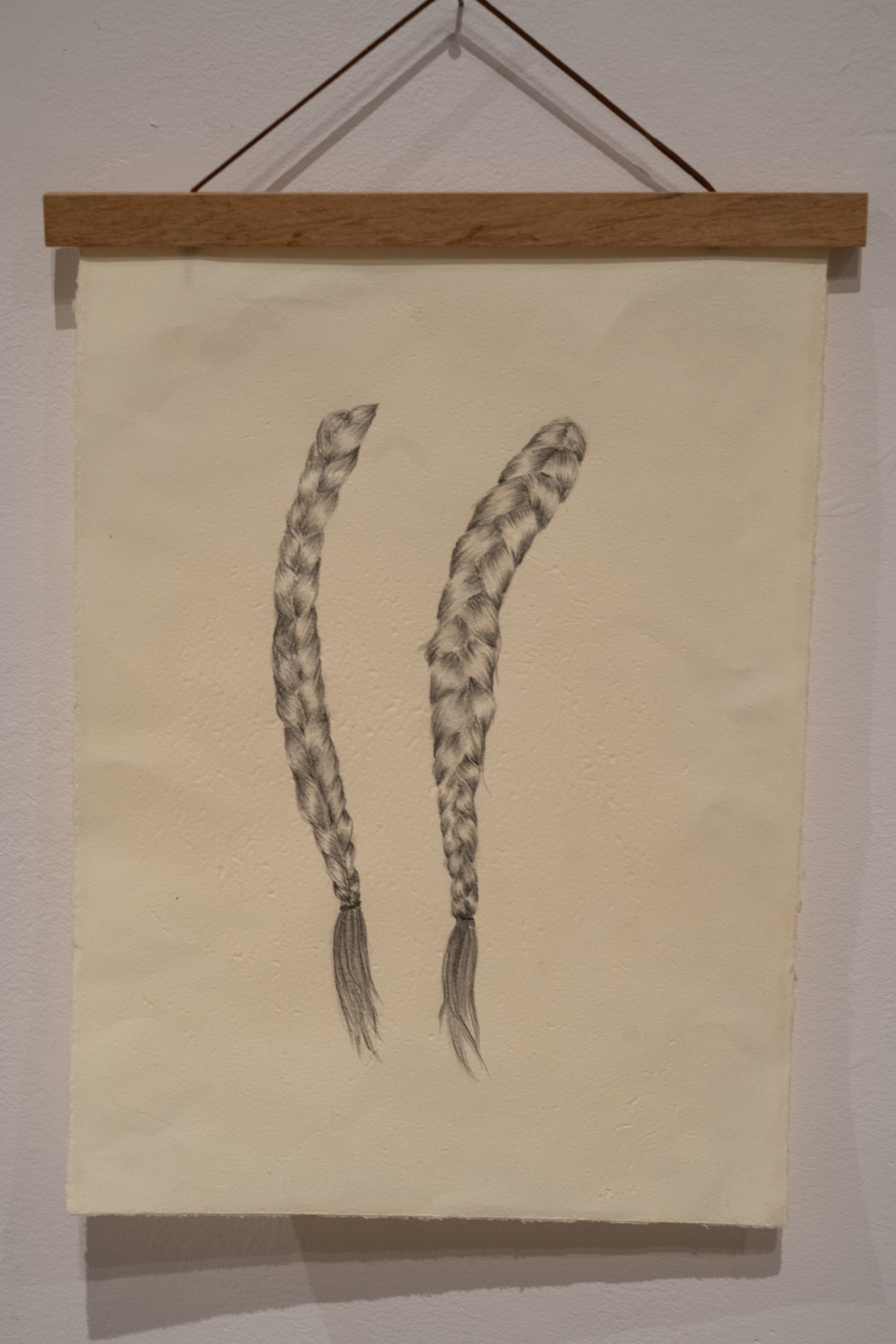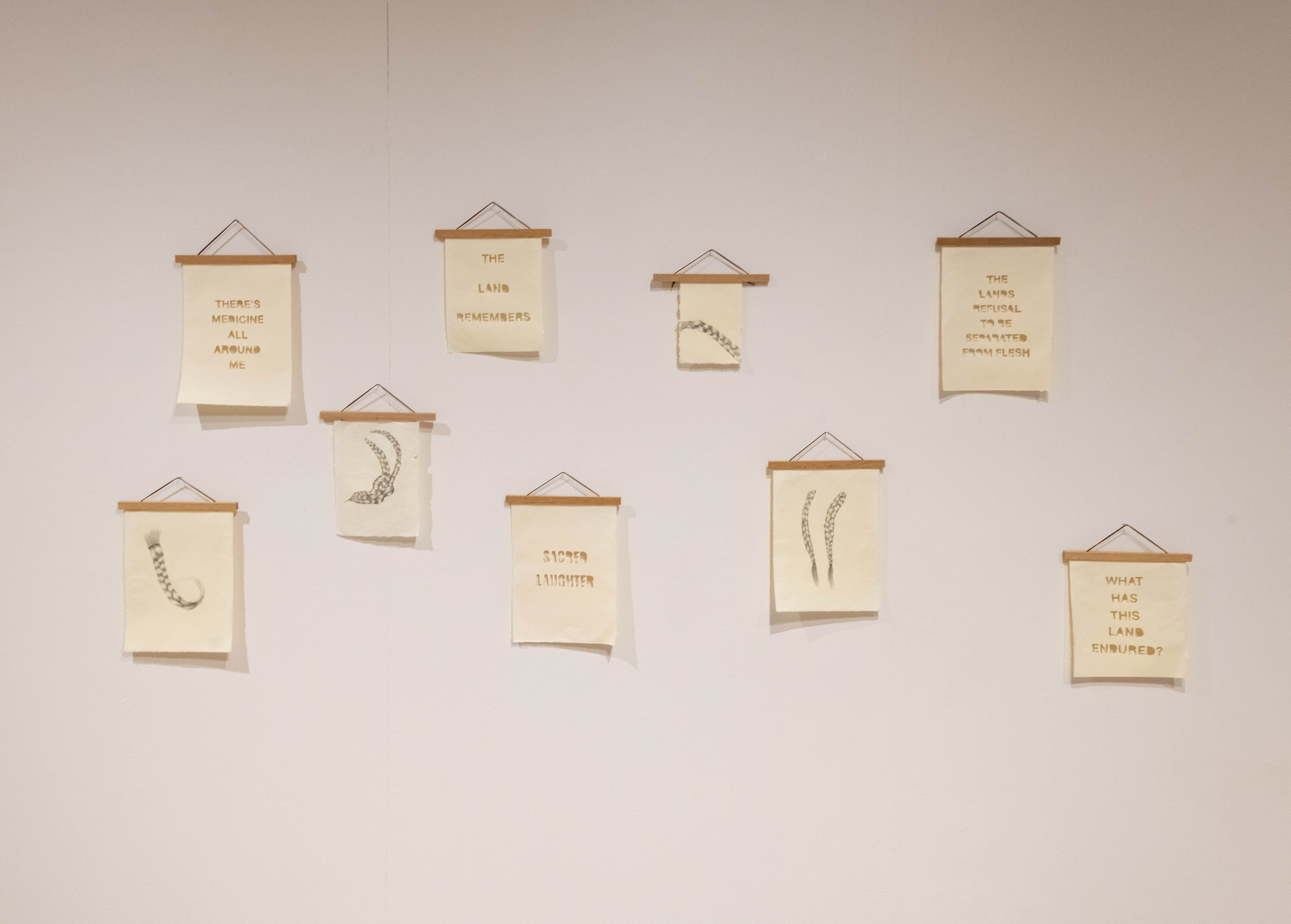 The series includes handmade paper, drawings, and prose which all reflect the importance of knowing, sharing moments, and building reciprocal yet complex relationships with the land. This work builds on my previous interactive installation, "Gepmite'tg," which featured over 300 sheets of paper. In that installation, participants used sage ash to reveal the embossed names of Indigenous women lost to violence. By blending and reconstituting this marked paper, I created newly formed sheets as a symbol of collective grief, solidarity, and kinship of the communities impacted by the epidemic of Missing and Murdered Indigenous Women, Girls, and Two-Spirited individuals (MMIWG2S+).